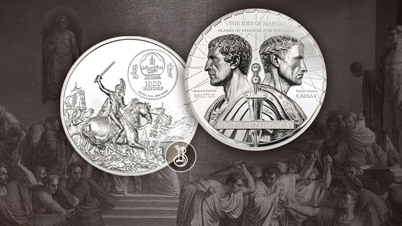 Серия памятных монет «Исторические соперничества» открывается одной из самых драматичных битв за власть в древнем мире: Брут против Цезаря. Серебряная монета весом в 2 унции посвящена печально известному предательству, когда Юлий Цезарь был убит своим ближайшим союзником и другом Марком Юнием Брутом. Выпуск отражает извечное столкновение верности, принципов и предательства – темы, которые актуальны и сегодня.