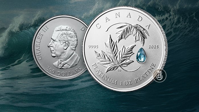 Обратная сторона монеты имеет блестящий рельеф и матовую поверхность (reverse proof), что позволяет сосредоточить внимание исключительно на классическом дизайне кленового листа и сверкающей аквамариновой «капле». Монета отчеканена из платины пробы 9995, масса – 31,16 грамма. Ограниченный тираж – всего 450 экземпляров.