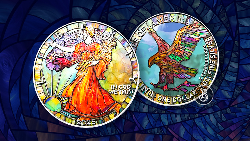 Уникальная серебряная монета является переосмыслением известной «Шагающей свободы» в стиле витражного искусства. Яркая окраска подчеркивает плавность линий, придавая монете вид произведения ар-нуво. Сложный мозаичный эффект усиливает глубину и яркость дизайна, гармонично объединяя классическую американскую символику с оригинальностью витражной техники.