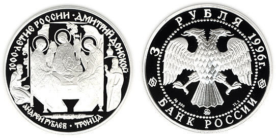 Серебряная монета Дмитрий Донской (Троица - икона Андрея Рублева, XV – 31.1 г чистого металла, 3 RUB, 1996