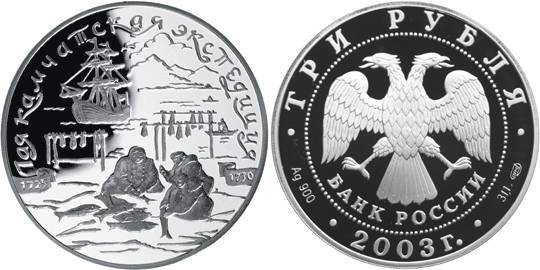 Серебряная монета Камчадалы – 1-я Камчатская экспедиция 31.1 г чистого металла, 3 RUB, 2003