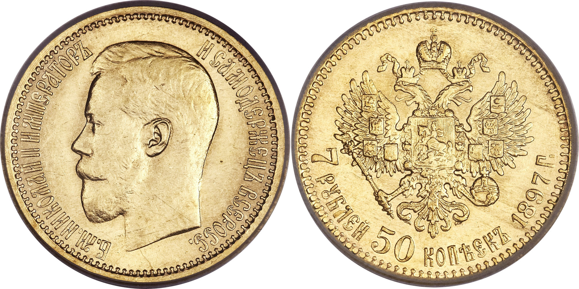 Золотые монеты номиналом 7 рублей 50 копеек. Монета чеканилась только в 1897 году. Общий вес монеты составляет 6,45 г. Гурт монеты содержит надпись «ЧИСТАГО ЗОЛОТА 1 ЗОЛОТНИКЪ 34,68 ДОЛЕИ», а также знак минцмейстера Санкт-Петербургского монетного двора Аполлона Грасгофа — заключённые в скобки буквы А,Г.