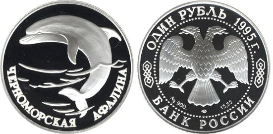 Серебряная монета Афалина черноморская – Красная книга 15.55 г чистого металла, 1 RUB, 1995