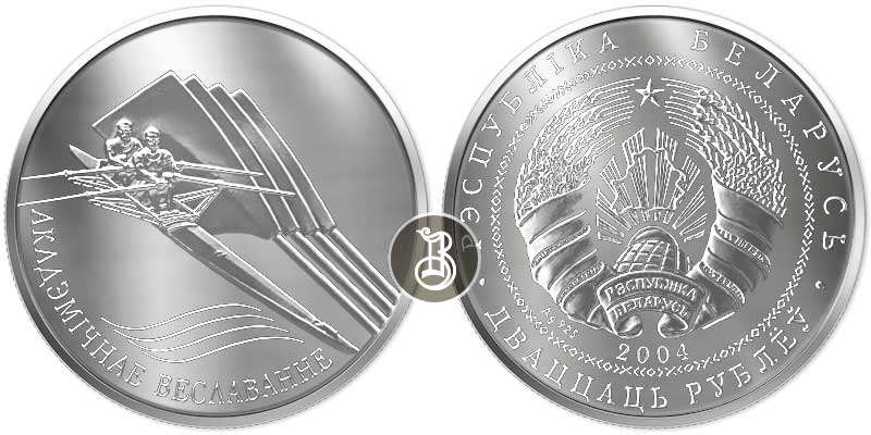 Серебряная монета Академическая гребля – 31.1 г чистого металла, 20 BYR, 2004