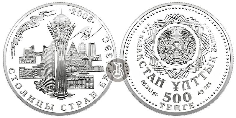 Серебряная монета Астана. Столицы стран ЕврАзЭС – 28.77 г чистого металла, 500 KZT, 2008