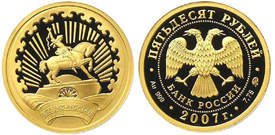 Золотая монета К 450-летию добровольного вхождения Башкирии в состав России – 7.78 г чистого металла, 50 RUB, 2007