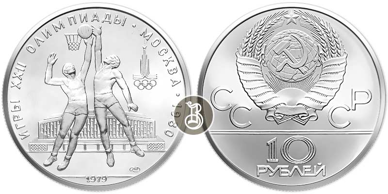 На оборотной стороне монеты расположено рельефное изображение двух баскетболистов, один атакует, второй защищает баскетбольное кольцо, за ними универсальный спортивный комплекс, где проводились игры по баскетболу справа сверху эмблема XXII Олимпийских игр, справа снизу монограмма монетного двора «ЛМД», внизу у канта год выпуска монеты «1979».