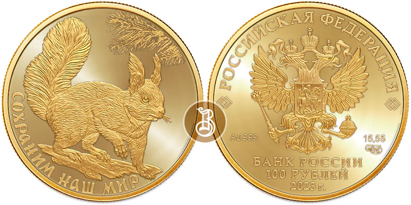 Золотая монета Белка обыкновенная – Сохраним наш мир 15.55 г чистого металла, 100 RUB, 2023