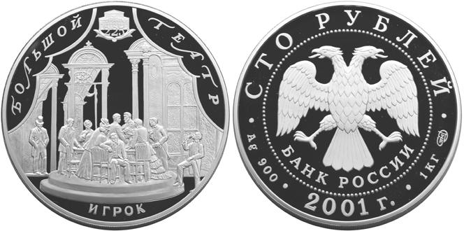 Серебряная монета 225-летие Большого театра (Сцена из третьего дейст – 225-летие Большого театра 1000 г чистого металла, 100 RUB, 2001