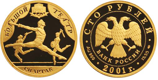 Золотая монета 225-летие Большого театра (Сцена из балета А.И. Ха – 225-летие Большого театра 15.55 г чистого металла, 100 RUB, 2001