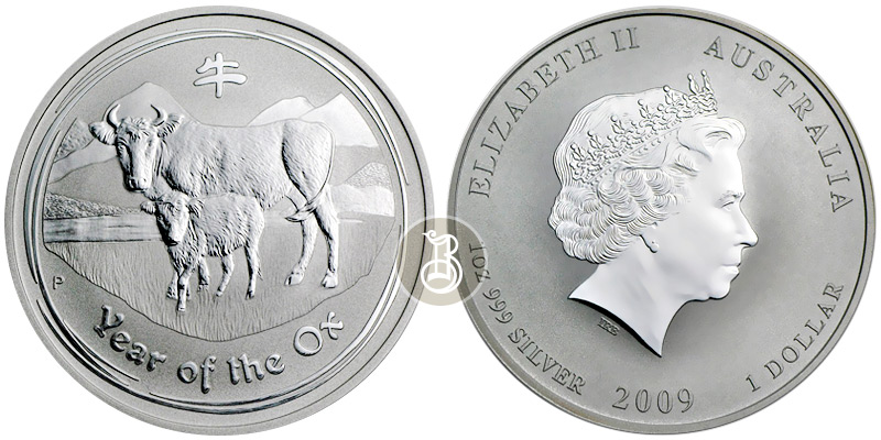 Серебряная монета Бык – Лунная серия II 31.1 г чистого металла, 1 AUD, 2009