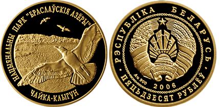 Золотая монета Нац. парк "Братиславские озера". Чайка серебристая – Национальные парки и заповедники Беларуси 7.2 г чистого металла, 50 BYR, 2006