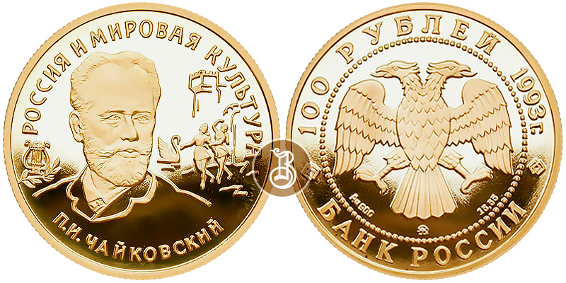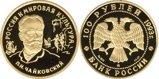 Золотая монета П.И.Чайковский (Россия и мировая культура) – Историческая 15.55 г чистого металла, 100 RUB, 1993