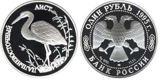 Серебряная монета Дальневосточный аист – Красная книга 15.55 г чистого металла, 1 RUB, 1995