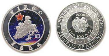 Серебряная монета Дева – Знаки зодиака 26.16 г чистого металла, 100 AMD, 2008
