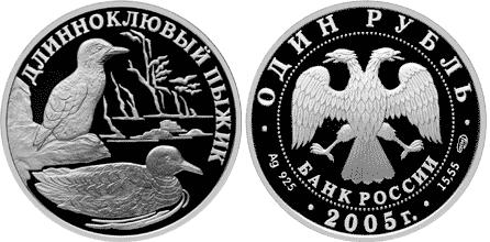 Серебряная монета Длиноклювый пыжик – Красная книга 15.55 г чистого металла, 1 RUB, 2005