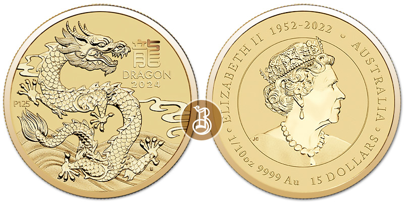 Золотая монета Австралийский Лунар. Год Дракона. 1/10 унции. – Лунная серия III 3.11 г чистого металла, 15 AUD, 2024