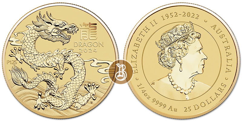 Золотая монета Австралийский Лунар. Год Дракона. 1/4 унции – Лунная серия III 7.78 г чистого металла, 25 AUD, 2024
