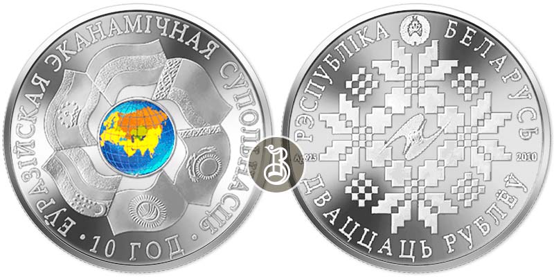 Серебряная монета ЕврАзЭС 10 лет. – 31.1 г чистого металла, 20 BYR, 2010