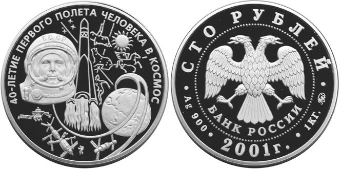 Серебряная монета 40-летие космического полета Ю.А. Гагарина – 1000 г чистого металла, 100 RUB, 2001