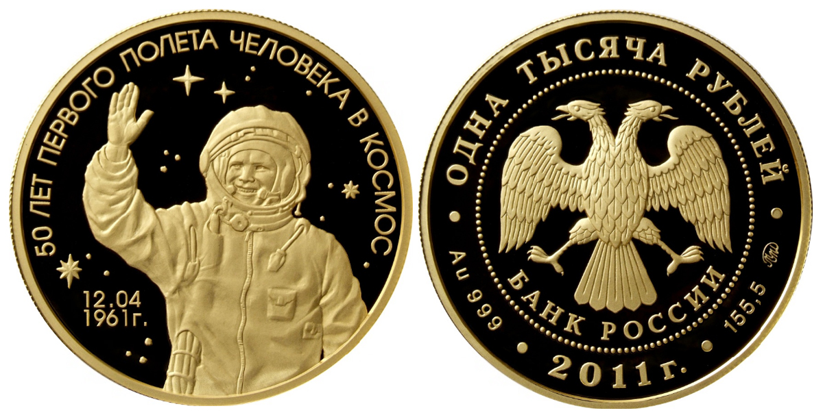 Золотая монета 50 лет первого полета человека в космос – 155.5 г чистого металла, 1 000 руб., 2011