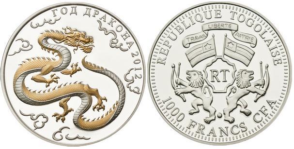 Серебряная с золотом монета Год дракона – Лунный календарь 25 г чистого металла, 1 000 CFA, 2012