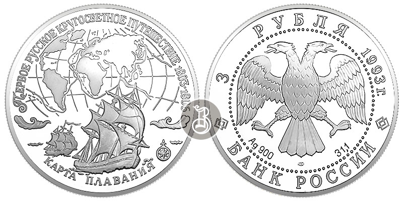 Серебряная монета Карта плавания – Географическая 31.1 г чистого металла, 3 RUB,