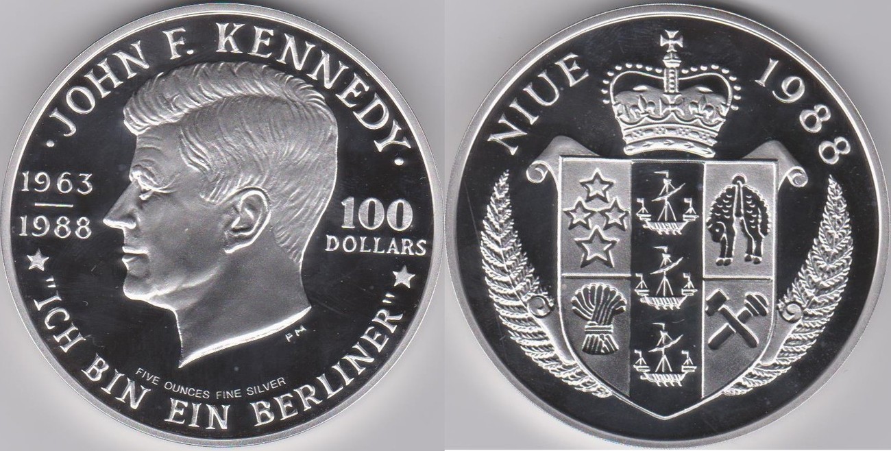 Серебряная монета Джон Кеннеди "Я - берлинец" – 155.5 г чистого металла, 100 NZD, 1988