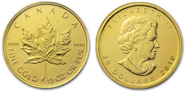 Золотая монета Канадский кленовый лист. 1/2 унции – 20 CAD, вес чистого металла 15.55 г, с 2012 г.в.