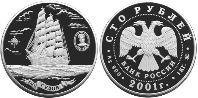 Серебряная монета Барк "Седов" (и портрет Г.Я. Седова) – Парусники России 1000 г чистого металла, 100 RUB, 2001