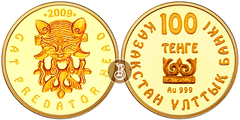 Золотая монета Кошачий хищник с оленями – Легендарные золотые сокровища 1.24 г чистого металла, 100 KZT, 2009