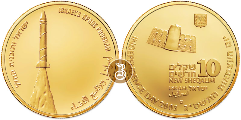 Золотая монета Космическая программа Израиля – 55-ая годовщина Дня независимости 15.55 г чистого металла, 10 ILS, 2003