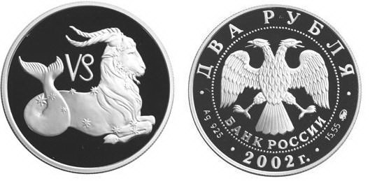 Серебряная монета Козерог – Знаки зодиака 2 RUB, вес чистого металла 15.55 гр., 2002