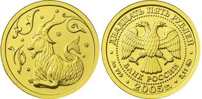 Золотая монета Козерог – Знаки зодиака 3.11 г чистого металла, 25 RUB, 2005