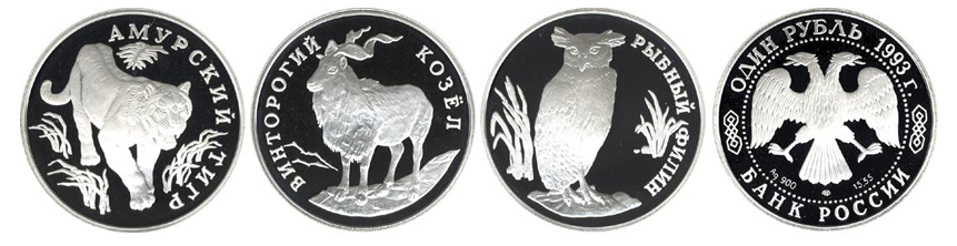 Набор серебряная монет Амурский тигр, Винторогий козел, Рыбный филин – Красная книга Серебро, 46.65 гр.