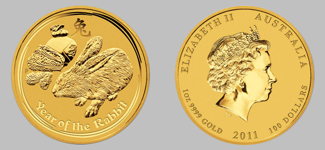Золотая монета Австралийский Лунар. Год Кролика. 1 унция – Лунная серия II 31.1 г чистого металла, 100 AUD, 2011