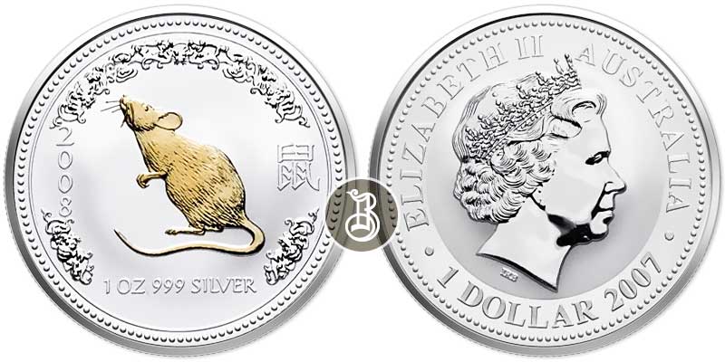 Серебряная монета Год крысы с позолотой – Лунная серия I 1 AUD, вес чистого металла 31.1 гр.