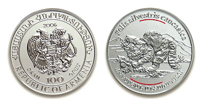 Серебряная монета Лесная кошка – Исчезающие виды кавказской фауны 26.16 г чистого металла, 100 AMD, 2006
