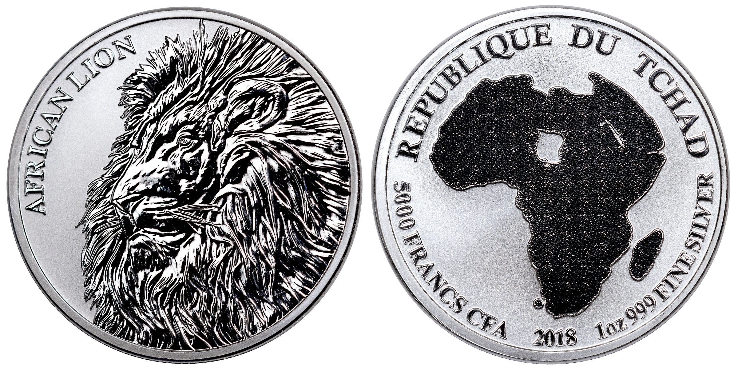 Серебряная памятная (коллекционная) монета Лев, серебро, 1 oz, Чад, 2018, 31,1 гр., (1 oz), проба 999