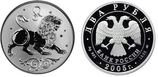 Серебряная монета Лев – Знаки зодиака 2 RUB, вес чистого металла 15.55 гр., 2005