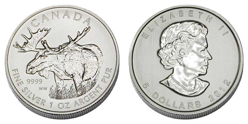 Серебряная монета Лось – Дикая природа Канады 31.1 г чистого металла, 5 CAD, 2012