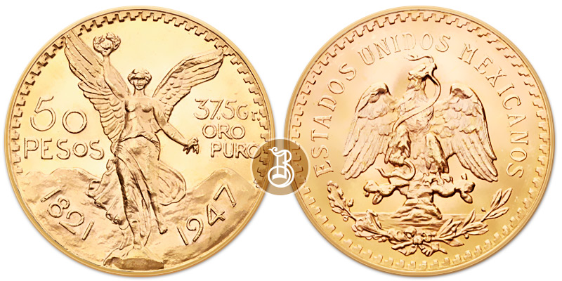 В 1921 году была впервые выпущена, пожалуй, самая известная мексиканская золотая монета – 50 песо, также известная как «Сентенарио». Монета содержит 37,5 грамма золота и была изготовлена мексиканским монетным двором. На монете изображен «Ангел независимости» или «Крылатая победа». В правой руке она держит лавровый венок, а в левой - разбитые цепи. Золотые 50 песо или Сентенарио чеканились с 1921 до 1931-й год, затем с 1943 по 1947-й, с 1949 по 1972 год монеты чеканились с датой 1947 года. Также с датой 1947 сентенарио выпускались в 1996 году и с 2000 по 2009 год.