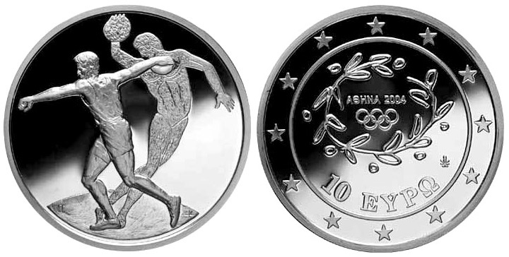 Серебряная монета Метание диска – XXVIII летние Олимпийские Игры, Афины 2004 31.1 г чистого металла, 10 EUR, 2004