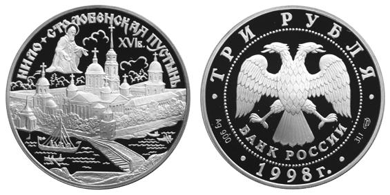 Серебряная монета Нило - Столобенская пустынь. – Памятники архитектуры России 31.1 г чистого металла, 3 RUB, 1998