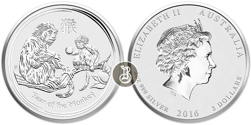 Серебряная монета Обезьяна – Лунная серия II 62.2 г чистого металла, 2 AUD, 2016