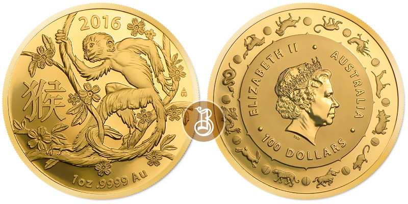 Золотая монета Австралийский Лунар. Год Обезьяны. 1 унция – 31.1 г чистого металла, 100 AUD, 2016