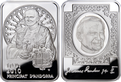 Серебряная монета Папа Римский Иоанн Павел II – 26.16 г чистого металла, 10 Динер, 2010
