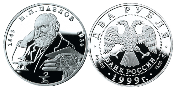 Серебряная монета 150-летие со дня рождения И.П.Павлова – Выдающиеся личности России 15.55 г чистого металла, 2 RUB, 1999