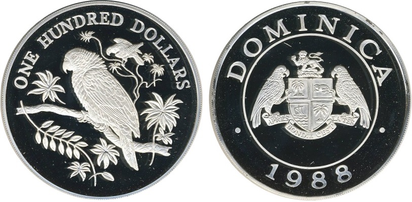 Серебряная монета Попугай – Тропические птицы 119.88 г чистого металла, 100 XCD, 1998