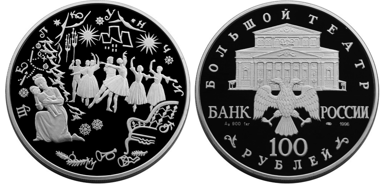 Серебряная монета Щелкунчик (Мари под елкой с куклой Щелкунчиком) – Русский балет 1000 г чистого металла, 100 RUB, 1996